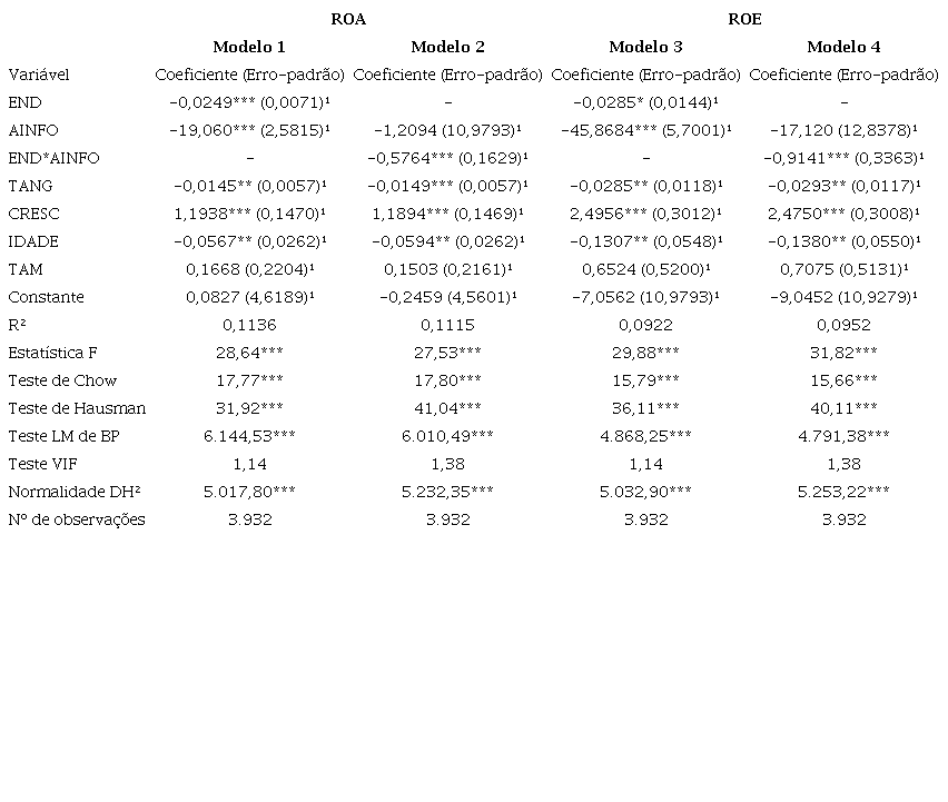Sobre os outros pressupostos dos modelos multivariados, o Teste de Doornik-Hansen rejeitou a hipótese nula de presença de normalidade multivariada em todos os modelos multivariados. O teste de BP e de Wooldridge rejeitaram a ausência de autocorrelação e heterocedasticidade na distribuição dos dados; por isso, optou-se por amenizar tais problemas com o emprego de erros-padrão robustos clusterizados nos indivíduos. Com base nisso, são apresentados na Tabela 3 os resultados relacionados ao impacto do endividamento sobre a rentabilidade, e a moderação desta relação por meio da assimetria da informação.