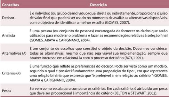 Os conceitos básicos que envolvem multicritério como apoio à tomada de decisão são decisor, analista, conjunto de alternativas (ou conjunto de escolhas), critérios e pesos. No Quadro 1, apresenta-se a descrição para esses conceitos.