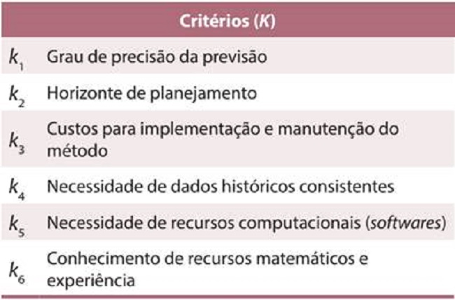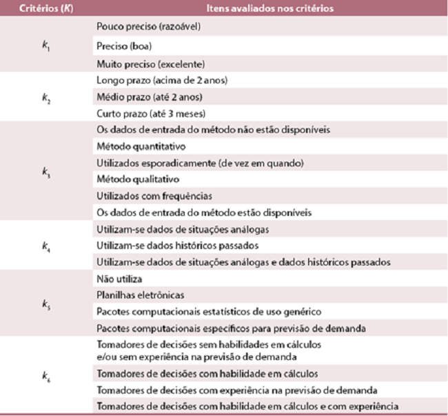 Os seis critérios usados nesta pesquisa para a seleção de cada método de previsão de demanda são denotados pelo conjunto K = {k1, k2, k3, k4, k5, k6} e apresentados no Quadro 9. Eles foram identificados no questionário de pesquisa.