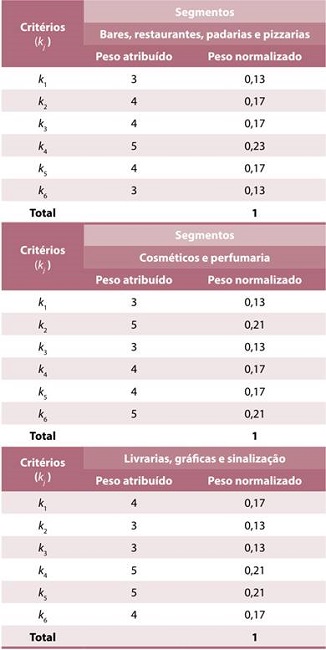 Os pesos atribuídos aos critérios foram definidos com base na coleta de dados com os decisores, que corresponde aos respondentes do questionário das franqueadoras contempladas na análise dos três segmentos de atuação das franquias. Na equação (7), é apresentado o cálculo do peso normalizado, em que Pn = peso normalizado e Pa = peso atribuído.