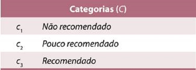 Após identificar os critérios e atribuir seus respectivos pesos, identificaram-se as categorias que forneceram uma recomendação de ação para o analista desta pesquisa. Foram estabelecidas três categorias, denotadas pelo conjunto C = {c1, c2, c3}, conforme o Quadro 12, sendo a categoria c1 aquela que representa os resultados desfavoráveis e a c3, a que representa resultados favoráveis.