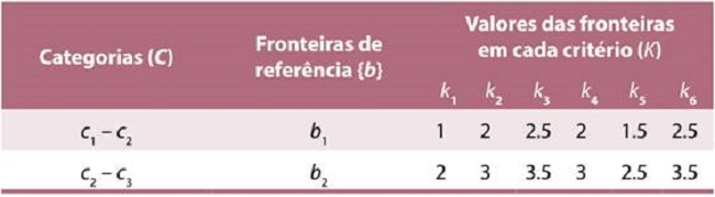 Após a padronização das matrizes de avaliação, foi necessário estabelecer fronteiras de referência entre cada uma das categorias estabelecidas. Tais fronteiras representam as categorias que o analista e os decisores consideram necessárias à distribuição das alternativas e foram representadas por {b}.