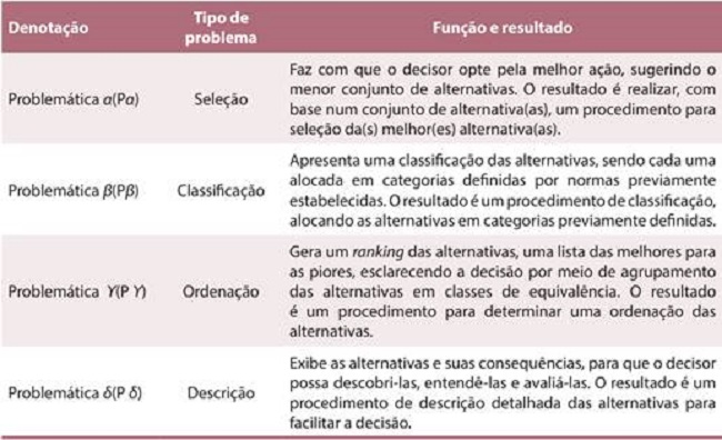 Para Gomes, Araya e Carignano (2004), a medida de importância relativa dos critérios para o decisor é denominada de peso, que é quando alguns critérios terão maior importância que outros. Assim, pode-se afirmar que, em razão de um problema de decisão, uma problemática é abordada pelo apoio multicritério à decisão. A seguir, apresentam-se os tipos de problemáticas.