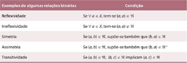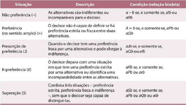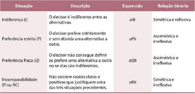 Dado um conjunto de alternativas (A), considera-se que o decisor seja capaz de declarar sua preferência ou indiferença entre elas. Segundo Gomes, Araya e Carignano (2004), a expressão das preferências do decisor, quando realiza comparações, se dá por relações binárias (?). No Quadro 3, apresentam-se as propriedades de alguns exemplos de relações binárias.