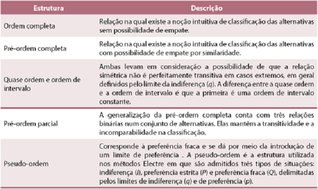 As principais estruturas de preferência do apoio multicritério à decisão sobre um conjunto de alternativas são descritas no Quadro 6.