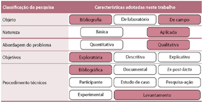 Para a classificação da pesquisa, utilizou-se Gil (2008). No Quadro 7, apresentam-se, de forma geral, as classificações da pesquisa. As características adotadas neste trabalho, em cada classificação da pesquisa, encontram-se em destaque.