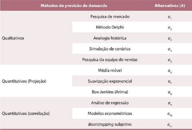 Nesta pesquisa, não foram usados todos os métodos de previsão de demanda disponíveis na literatura. Buscou-se selecionar os mais utilizados nos estudos de Chambers, Mullick e Smith (1971), Georgoff e Murdick (1986), Yokum e Armstrong (1995), Armstrong (2001), Kahn (2002), Armstrong e Fildes (2006), mais citados na literatura.