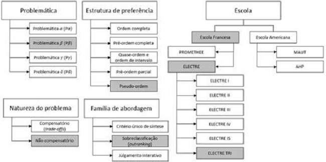 A escola francesa se divide essencialmente em dois grupos: Promethee e família Electre. Os métodos multicritérios existem com a finalidade de esclarecer um problema relacionado com a classificação, a ordenação ou a seleção de alternativas (ROY, 1991). Nesta pesquisa, definiu-se que o modelo utilizado seria o de classificação.