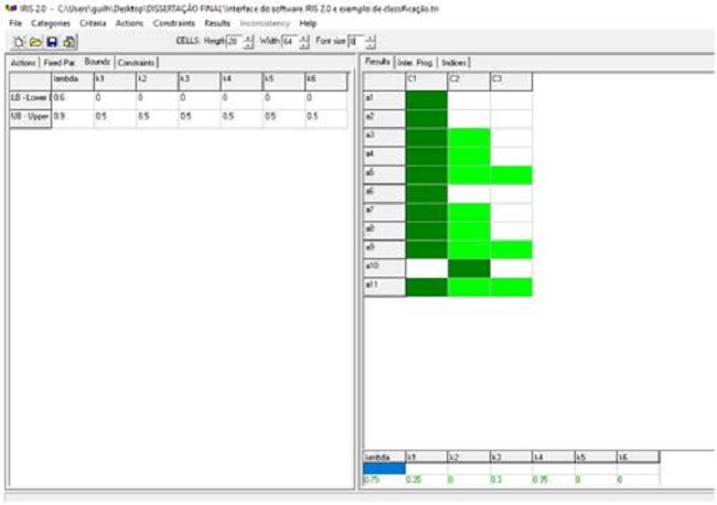 Ambas as análises de sensibilidade foram feitas no Iris 2.0, de modo que as variações na classificação das alternativas em cada análise são brevemente discutidas na próxima seção. Na Figura 8, apresenta-se uma representação da execução do Electre TRI no Iris 2.0.