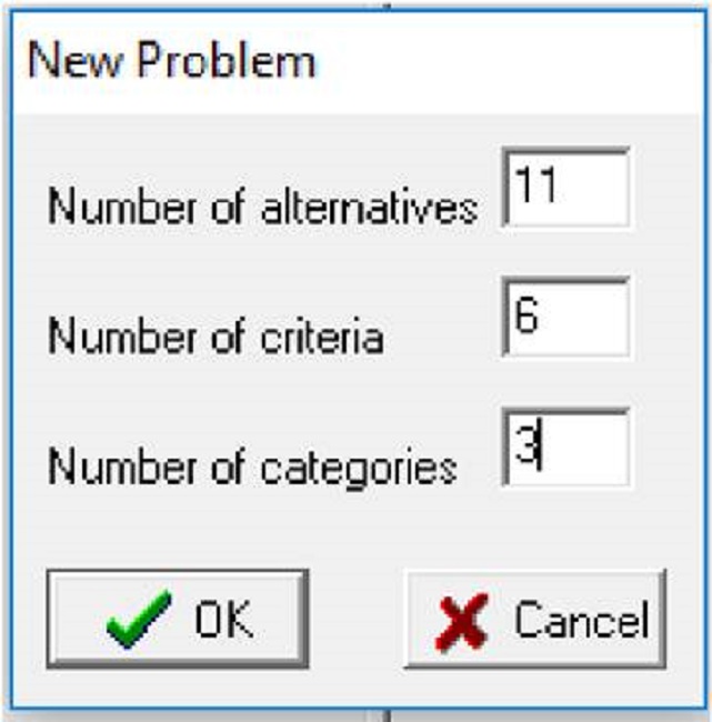 Para a execução do algoritmo de classificação do Electre TRI, inicialmente, inseriram-se como entrada números de alternativas (A = 11), critérios (K = 6) e categorias (C = 3), conforme Figura 4.