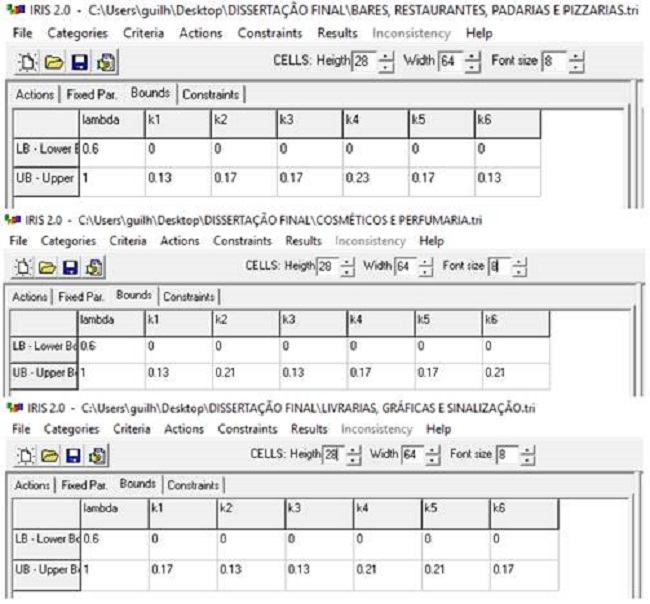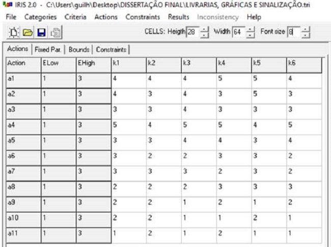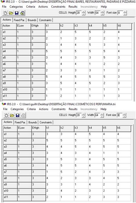 Para o método Electre TRI, usou-se o software Interactive Robustness analysis and parameters’ Inference for multicriteria Sorting problems (Iris), versão 2.0 demo - disponível para testes e desenvolvimento de trabalhos acadêmicos, apresentado por Dias e Mousseau (2002). O Iris 2.0 foi responsável por auxiliar o analista na representação das preferências dos decisores (franqueadoras).
