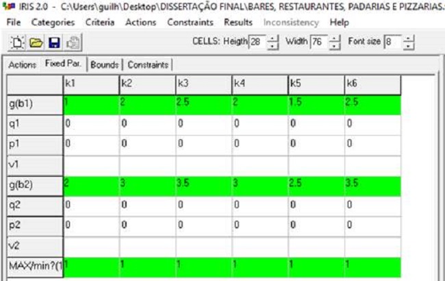 Os limites entre as categorias é uma definição necessária para que se possam enquadrar as alternativas sem nenhuma dúvida. A inserção desses valores no Iris 2.0 está ilustrada na Figura 6. Os limiares de indiferença (q), preferência (p) e veto (v) foram considerados iguais a zero, admitindo-se critérios verdadeiros para esse contexto. Tal determinação foi considerada pela dificuldade encontrada pelos decisores em quantificar suas preferências e entender, de forma qualitativa, a avaliação sobre as categorias. A inserção desses valores no Iris 2.0 também se encontra na Figura 6.