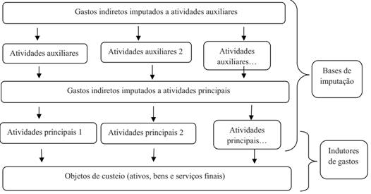 O método ABC apresenta duas fases: na primeira, são destinados os custos às atividades tendo em conta o consumo dos recursos, expressos pelos cost drivers de recursos. Na segunda fase, os custos das atividades são relacionados aos outputs, ou seja, aos produtos, clientes, canais, por meio dos cost drivers das atividades, tendo por base o respectivo consumo destas (INNES e MITCHELL, 2005).