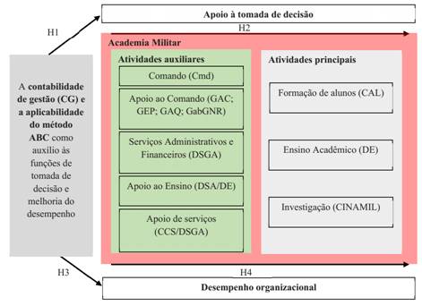 Desse modo, em conformidade com a revisão da literatura efetuada, com vista a responder à questão de investigação, importa avaliar como a contabilidade de gestão poderá contribuir para o apoio à tomada de decisão nos diversos níveis organizacionais e nas diversas atividades desenvolvidas, otimizando-se, assim, o desempenho organizacional. O modelo de investigação subjacente a esta investigação encontra-se descrito na Figura 5, propondo-se as seguintes hipóteses: