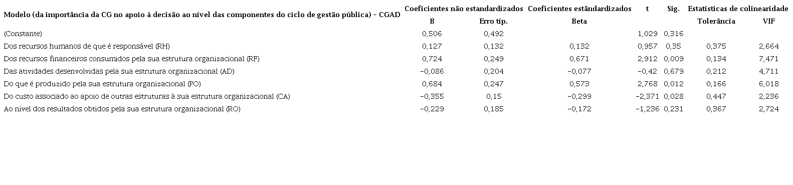 Relativamente à H1, quanto ao modelo linear que explica a importância da CG na tomada de decisão da estrutura organizacional da AM, bem como às componentes do ciclo de gestão pública, obtiveram-se os resultados2 da Tabela 2: