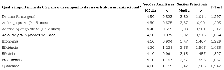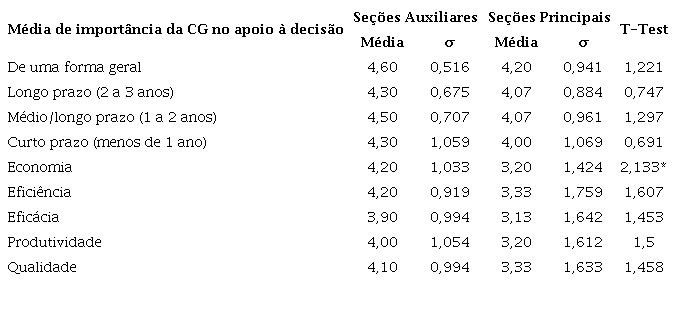 Verifica-se, assim, que o efeito percebido sobre a influência da CG no apoio à decisão das diversas componentes do ciclo de gestão pública é alto ao nível da importância dos recursos financeiros consumidos (input) e dos produtos das estruturas organizacionais (outputs). Quando existe um acréscimo de 1 ponto na importância da CG no apoio à decisão, observa-se um aumento, em média, de 0,724 pontos na importância dos recursos financeiros consumidos e de 0,684 pontos na importância do que é produzido pela estrutura organizacional (output), enquanto que, quanto à média de importância do custo associado ao apoio de outras estruturas às estruturas organizacionais, há uma diminuição de 0,355.