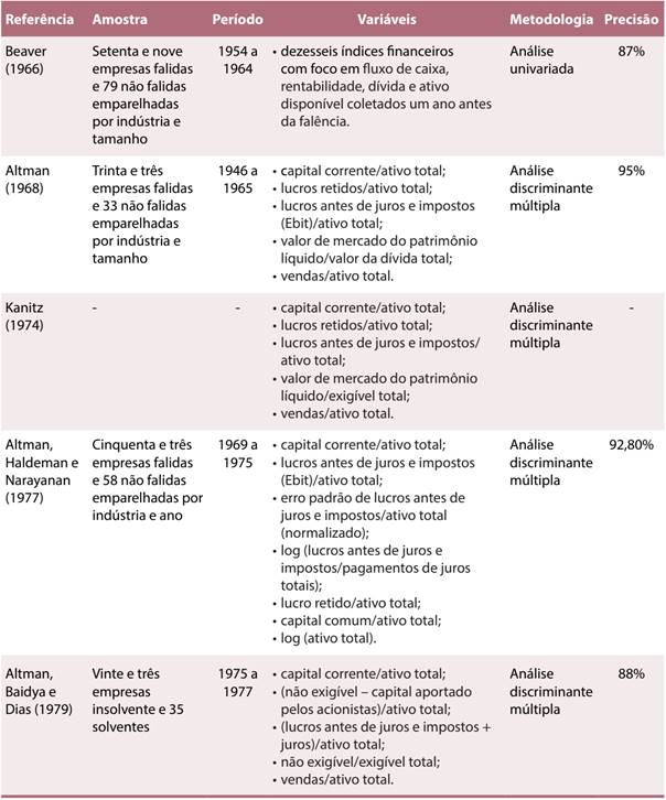 O uso de indicadores financeiros em modelos de previsão de falências e de dificuldade financeira vem se mostrando importante desde o trabalho de Beaver (1966), que examinou a previsibilidade de 14 índices financeiros e concluiu que a razão entre fluxo de caixa operacional sobre o total da dívida era suficiente para prever a situação financeira das empresas. Depois, o modelo de Z-score criado por Altman (1968) foi considerado, por muitos pesquisadores, profissionais e gestores, uma ferramenta precisa para prever falência das empresas até três anos antes.