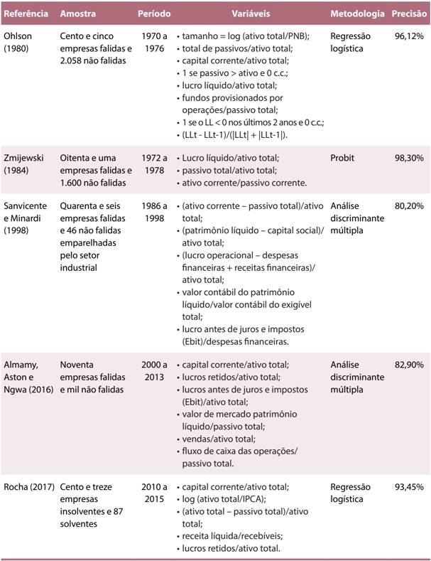 Rocha (2017) replicou o modelo de Ohlson (1980) para previsão de falência das empresas de capital aberto no Brasil, utilizando variáveis contábeis com um ano de antecedência. Com esse método, foram classificadas corretamente 93,45% empresas com dados contábeis de um ano de antecedência do evento de falência.