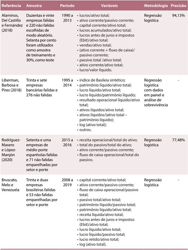 Diversos outros trabalhos foram publicados ao longo do tempo utilizando indicadores financeiros, e um resumo deles está apresentado no Quadro 1. É importante notar que os modelos usados apresentam boa precisão, apesar de tratarem de amostras e contextos diferentes. No Quadro, 1, 1 temos os principais indicadores utilizados pelos trabalhos e nota-se, como indicado por Rodríguez-Masero e López-Manjón (2020), que o fluxo de caixa não é comumente utilizado entre esses indicadores financeiros.