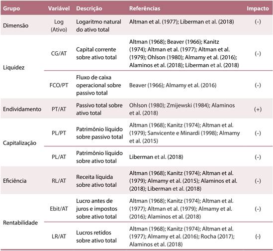 Dimensão:Representado pelo logaritmo natural do ativo total, está sendo utilizado como controle e busca mensurar a dimensão das instituições.Liquidez:Contempla o capital corrente sobre ativo total e o fluxo de caixa operacional sobre passivo total. Como o capital corrente é a diferença entre o ativo corrente e o passivo corrente, o primeiro indicador responde a um efeito esperado quando uma empresa apresenta perdas operacionais consistentes e terá encolhimento de ativos correntes em relação ao total de ativos. Já o segundo indicador é um índice que mede a capacidade de pagamento da dívida com o caixa gerado internamente pela empresa.Endividamento:Composto por passivo total sobre ativo total. Também conhecido como índice de endividamento total, é um indicador de risco e mede o percentual de capital de terceiros que a empresa tem para financiamento das operações corporativas.Capitalização:Os indicadores desse grupo são relacionados à estrutura de capital das empresas, medindo quanto elas estão protegidas pelo capital próprio com relação às suas obrigações com terceiros, no caso de patrimônio líquido sobre passivo total e da capitalização (patrimônio líquido sobre ativo total). Eficiência:Representada pelo indicador de vendas (ou receita líquida) sobre ativo total, que mede a rotatividade do capital, ou seja, a capacidade de geração de vendas a partir dos ativos da empresa.Rentabilidade:Inclui os recursos que mensuram o lucro das empresas em relação aos próprios recursos empregados. São eles: lucro antes de juros e impostos sobre ativo total e lucros retidos sobre ativo total. O último índice contempla a idade da empresa como uma variável implícita, pois uma empresa relativamente jovem mostrará uma relação baixa, uma vez que não teve tempo de acumular lucro. Isso parece fazer sentido, pois a incidência de falha é maior em empresas jovens.No Quadro, estão listadas as variáveis a serem utilizadas nos modelos, acompanhadas de sua descrição, grupo, referências dos principais artigos que as utilizaram e o sinal esperado para previsão da probabilidade de falência. Um sinal negativo indica a expectativa de que um aumento no valor daquela variável reduza a possibilidade de falência das empresas, enquanto um sinal positivo indica que, quanto maior o indicador, maior a probabilidade de falência da empresa.