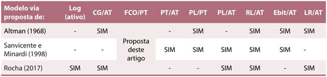 Como explicitado antes, o principal objetivo do presente estudo é avaliar se a variável fluxo de caixa operacional sobre passivo total (FCO/PT) é relevante para melhor estimar a previsão de falência de empresas brasileiras, quando ela for adicionada em três modelos apresentados na literatura: Altman (1968); Sanvicente e Minardi (1998); e Rocha (2017). De igual modo, pretende-se verificar se o acréscimo da variável FCO/PT melhora a previsão desses mesmos modelos ajustados.