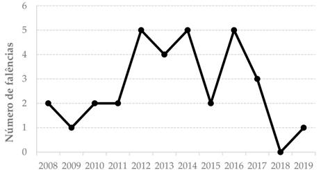 Este estudo utilizou os dados das 32 empresas brasileiras abertas (listadas na B3), não financeiras e não públicas, que faliram no período entre 2008 e 2019. As informações contábeis delas foram coletadas para 1, 2 e 3 anos antes de irem à falência pelo software Economatica®. A Figura 1 ilustra a quantidade de falências ao longo dos anos e revela que a maior incidência das quebras ocorreu entre 2012 e 2017.