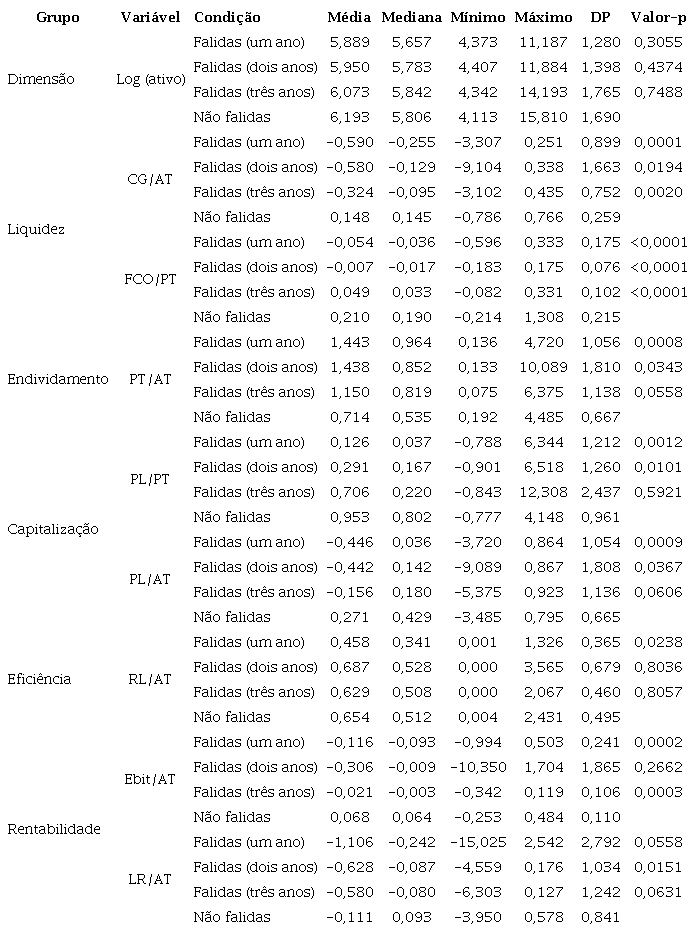 A Tabela 1 apresenta as estatísticas descritivas das variáveis explicativas selecionadas, separadas pela sua condição de não falida ou falida (um a três anos antes). Considerando as empresas não falidas em comparação com as falidas, foi feito um teste para comparar valores médios da variável explicativa em questão, presumindo variâncias desiguais e considerando o nível de significância de 10%.