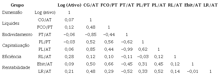 A Tabela 2 apresenta as correlações entre as variáveis independentes e tem o intuito de analisar se os modelos que serão propostos consideram variáveis sem terem altas correlações, visando evitar alto grau de multicolinearidade. Considerando os modelos descritos no Quadro 3, nota-se que: as variáveis PT/AT e PL/AT são forte e inversamente correlacionadas, sendo ambas utilizadas no modelo de Sanvicente e Minardi (1998); as variáveis CG/AT e PL/AT têm correlação forte e ambas serão utilizadas no modelo de Rocha (2017); e, por fim, a variável fluxo de caixa operacional sobre passivo total (FCO/PT) apresenta correlação no máximo moderada (inferior a 0,70, em valor absoluto) com todas as demais variáveis explicativas e, assim, poderá ser amplamente testada nos diferentes modelos.