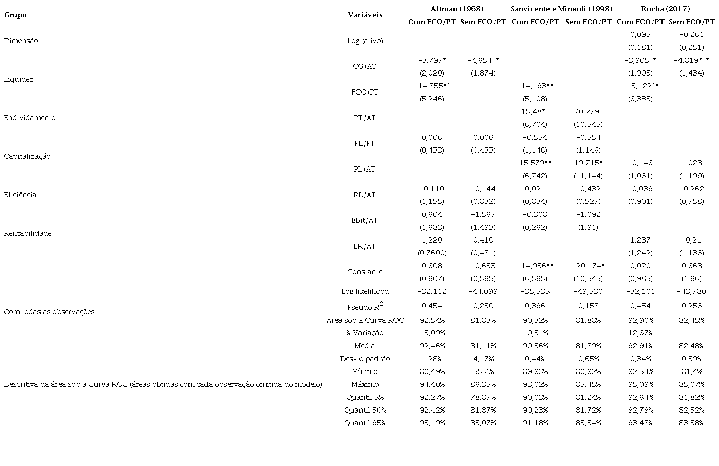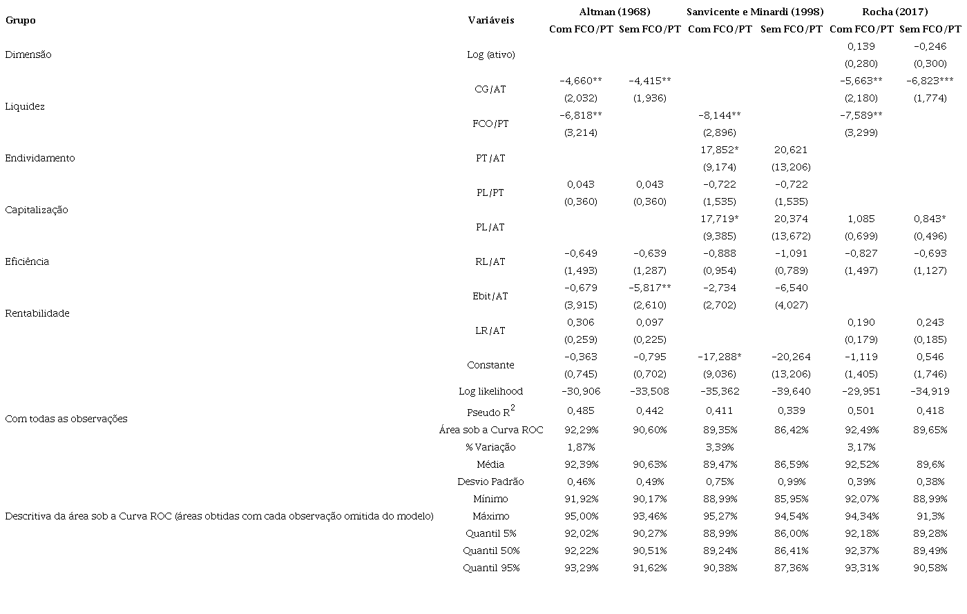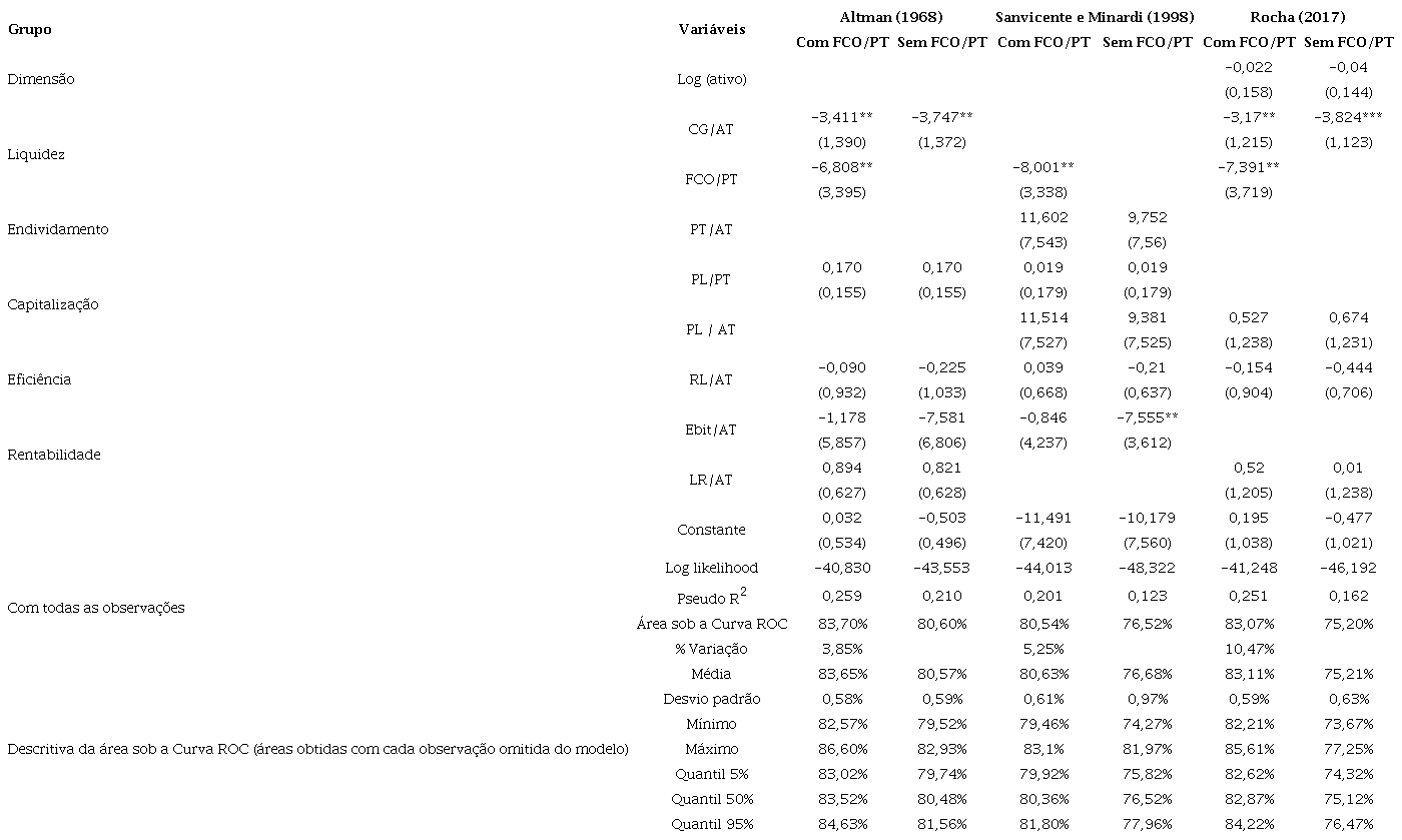 Analisando inicialmente os resultados da Tabela 3, o modelo de Altman (1968) com o acréscimo da variável fluxo de caixa operacional sobre passivo total faz com que a probabilidade de classificação correta de uma empresa (área sob a curva ROC) aumente em 1,87%, quando adicionada a variável FCO/PT ao modelo, passando de 90,60% para 92,29%. Outro ponto positivo de destaque é que essa variável se mostrou relevante para previsão de falência de empresas, ao nível de 5% de significância. A outra variável que também mede liquidez - capital corrente sobre ativo total - se mostrou essencial nos modelos com ou sem a presença do FCO/PT. Entretanto, a variável lucro antes de juros e impostos sobre ativo total (Ebit/AT) teve sua estimativa significante a 5% apenas no modelo sem a presença do FCO/PT.