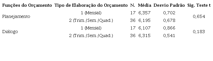 Para a análise de sensibilidade, são elaborados testes adicionais. Primeiramente, busca-se verificar se as empresas que desenvolvem o orçamento flexível apresentam diferenças na percepção de utilidade para as funções de planejamento e/ou diálogo. Para isso, o orçamento é segregado entre as empresas que o realizam de forma mensal daquelas com revisão trimestral, quadrimestral ou semestral. A Tabela 10 mostra o teste de diferença de médias das funções do orçamento pelo tipo de elaboração flexível, segregado pelo modelo mensal e outros modelos flexíveis.