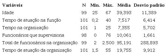 Da Tabela 1, destaca-se que o tempo médio do respondente na função de gestor é de 7,5 anos. Em termos gerais, eles possuem experiência em gestão e fazem a supervisão, em média, de 10 empregados. Além disso, percebe-se que os respondentes possuem maturidade, pela média de idade superior a 39 anos, e experiência, pelo tempo de atuação na organização ser de mais de 19 anos. Por fim, observa-se que as empresas possuem, em média, um porte intermediário por terem mais de 95 funcionários.