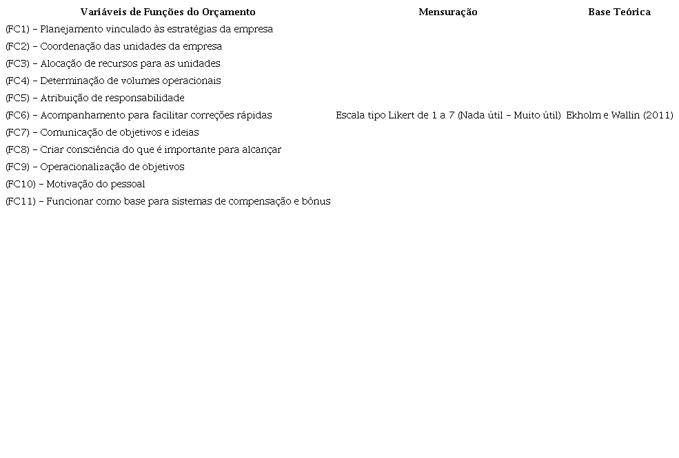 Em relação às funções do orçamento, os instrumentos empregados por Ekholm e Wallin (2011) foram utilizados como referência, e eles dividem as funções do orçamento em 11 itens e duas variáveis, no caso, funções de planejamento e diálogo, em uma escala de 1 a 7, em que 1 corresponde à categoria “nada útil” e 7, “muito útil”. Os autores mencionados se embasaram nas funções relatadas por Ax e Kullven (2005) e sugerem um delineamento quanto às múltiplas funções do orçamento. Para confirmar os agrupamentos das funções do orçamento em planejamento e diálogo, utilizou-se o método de análise fatorial confirmatória.