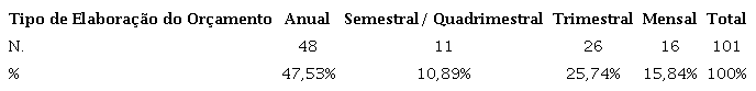 A Tabela 3 destaca que o maior número de organizações adere à periodicidade anual para a elaboração do orçamento (47,53%), seguido por 26 empresas que desenvolvem o orçamento de forma trimestral e 16, com revisão mensal. Por último, algumas organizações fazem o orçamento de forma quadrimestral e/ou semestral, o que representa 10,89%.