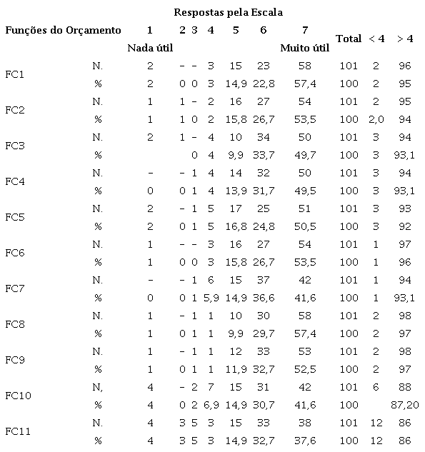 Por meio dos resultados descritos na Tabela 8, pode-se inferir que os gestores das organizações de tecnologia da informação percebem a utilidade das funções do orçamento de forma, visto que as médias foram superiores ao ponto médio, o que destaca que ambas as dimensões se aproximaram do valor máximo (7).