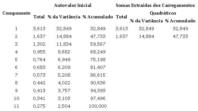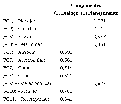 Na Tabela 5, descreve-se a análise de componente principal para as funções do orçamento. Os resultados apontam para gerar dois fatores, com percentual de informação de 32,849% no primeiro fator; e o segundo fator com 47,733%. Desse modo, confirma-se que as 11 funções do orçamento postas em questão são agrupadas em apenas dois fatores, que são denominados conceitualmente planejamento e diálogo.
