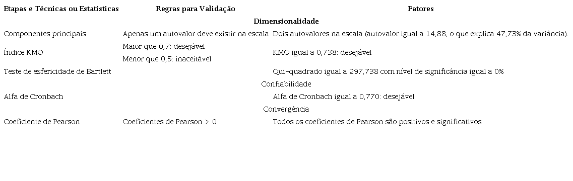 Os resultados de validação indicam que o teste KMO é considerado desejável (0,738), o teste de Esfericidade de Bartlett apresenta significância ao nível de 5% e o Alfa de Conbrach (0,770) também é considerado desejável. Comprova-se assim, a validação do instrumento de pesquisa, dos dados coletados e do agrupamento fatorial proposto, o que permite a continuidade da pesquisa.