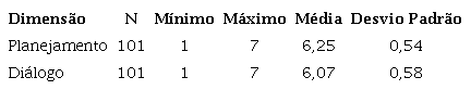 Em seguida, é elaborada a estatística descritiva das funções que se agruparam pela análise fatorial em planejamento e diálogo, buscando averiguar se existe preferência das organizações em relação à utilidade do orçamento para determinada função. Na Tabela 8, apresenta-se a estatística descritiva da dimensão intitulada utilidade do orçamento para a função de planejamento e diálogo.