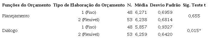 Além disso, é feito o teste de diferença de médias (t-student) de amostras independentes para verificar se o tipo de elaboração do orçamento pelo modelo fixo ou flexível impacta a utilidade do orçamento na função de planejamento e diálogo. A Tabela 9 mostra o teste de diferença de médias das funções do orçamento pelo tipo de elaboração.
