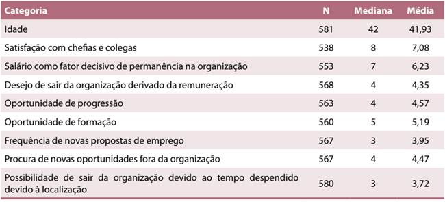 Considerando as variáveis quantitativas anteriormente apresentadas no Quadro 3, foi possível analisar que, em termos de idade, os trabalhadores possuem, em média, 41,93 anos; a satisfação com chefias e colegas é de 7,08 anos, em média; o salário como fator decisivo de permanência na organização é de, em média, 6,23 anos; já a oportunidade de formação, 5,19 anos em média; a oportunidade de progressão, 4,57 anos; a procura por novas oportunidades fora da organização, 4,35 anos; a frequência de novas propostas de emprego, 3,95 anos; e a possibilidade de sair da organização por causa do tempo de deslocamento, 3,72 anos.