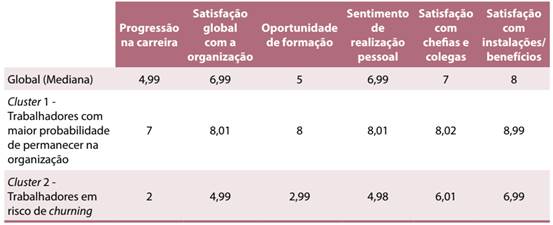 O Cluster 2 apresenta uma mediana inferior em comparação com a mediana global, em que se observam menor satisfação em permanecer na organização, contribuindo para o aumento da taxa de churning, além de progressão da carreira (mediana 2); satisfação global com a organização (mediana 4,99); oportunidade de formação (mediana 2,99); sentimento de realização pessoal (mediana 4,98), satisfação com chefias e colegas (mediana 6,01) e satisfação com as instalações e os benefícios (mediana 6,99).
