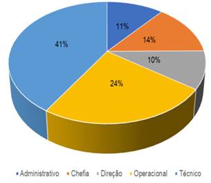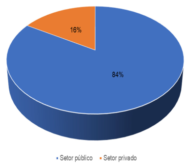 Por meio dos Gráficos 1 e 2, verifica-se que 84% dos respondentes pertencem a organizações do setor privado e que apenas 16% compõem organizações do setor público, e a função mais desempenhada pelos trabalhadores é a função técnica (41%).