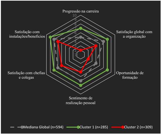 A análise TwoStep Cluster organizou os trabalhadores em dois agrupamentos, em que é possível observar, no Quadro 4 e no Gráfico 3, as avaliações medianas das variáveis consideradas como modelo de investigação. Além das perceções medianas globais referentes a cada variável, é possível notar também a diferença obtida pela análise TwoStep Cluster no que se refere às avaliações medianas atribuídas pelos trabalhadores pertencentes a cada um dos grupos nas suas respostas ao questionário (Gráfico 3).