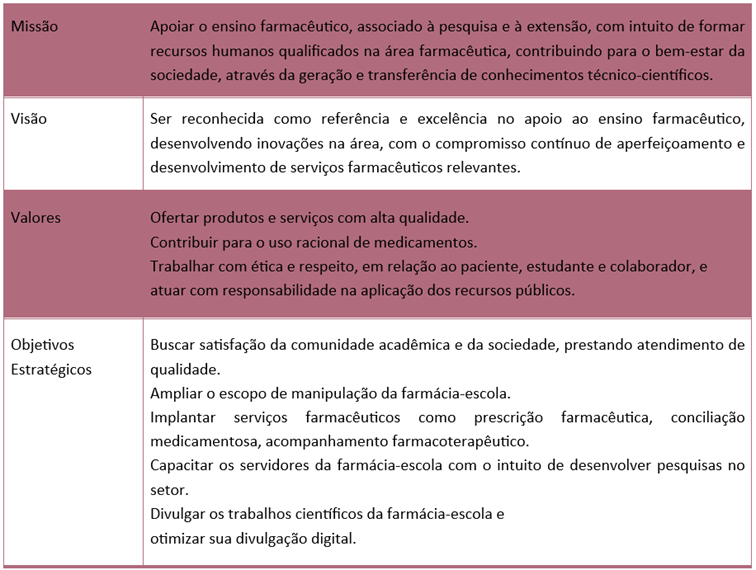 Os resultados coletados na primeira etapa permitiram a definição da missão, da visão, dos valores e dos objetivos estratégicos da farmácia universitária, conforme o Quadro 1.