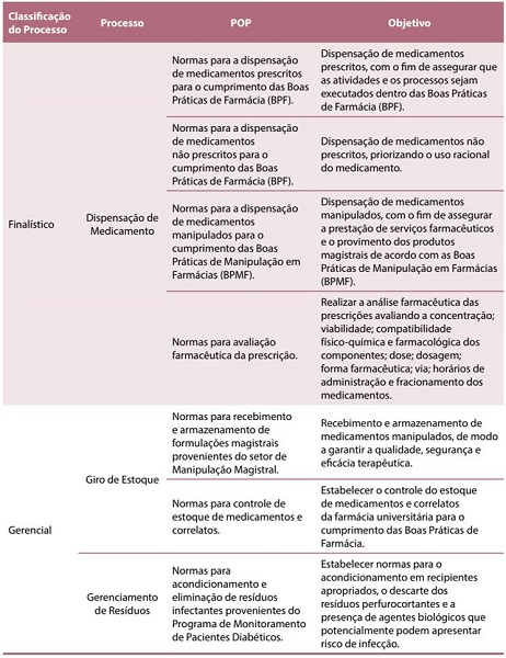 Etapa 2 - esta teve como objetivo conhecer e mapear os processos realizados na FU. Etapa documental em que foram analisados os procedimentos operacionais padrão (POPs) da FU. Foi realizada a análise dos processos já estabelecidos no setor de dispensação de medicamentos, de acordo com a análise documental dos POPs. Esses documentos contêm a descrição operacional dos processos e fazem parte do Manual de Boas Práticas Farmacêuticas, um dos mais importantes documentos exigidos pela Resolução da Diretoria Colegiada (RDC) nº 44/2009 da Agência Nacional de Vigilância Sanitária (ANVISA, 2009). A análise objetivou classificar os processos em gerenciais, finalísticos e por resultados, seguindo a classificação de Smith e Fingar (2003). Na análise, foram identificados todos os processos realizados no serviço, que, posteriormente, foram classificados em processos finalísticos ou processos gerenciais, conforme apresentado nos resultados.