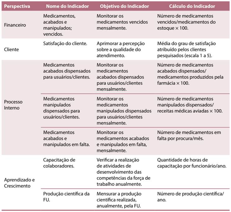 Na etapa seguinte, foram formulados sete indicadores estratégicos para o setor de dispensação de medicamentos da FU. Eles foram propostos com base nas perspectivas do BSC: financeira, cliente, processos internos e aprendizado e crescimento, conforme mostra o Quadro 3. O BSC é uma ferramenta de medição de desempenho que pode ser aplicada à FU, pois, além de possuir a dimensão de campo de prática de ensino, pesquisa e extensão, a FU executa ainda atividades de caráter comercial, como a dispensação de medicamentos para a comunidade a um baixo custo.