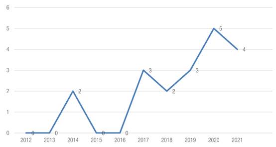 De acordo com os critérios de pesquisa, após todas as etapas de seleção estabelecidas, a busca teve como resultado 20 artigos que satisfazem a todos os requisitos. Analisando os artigos selecionados, verifica-se que a discussão sobre cidades inteligentes e segurança pública ganhou espaço a partir 2012, ano em que foi publicado o primeiro trabalho, e veio numa tendência crescente até 2020, como indicado na Figura 1.