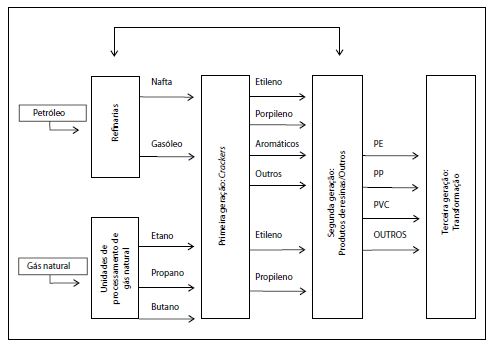 Por conta dos sucessivos choques do petróleo, as escalas mínimas de operação competitiva na indústria petroquímica aumentaram demasiadamente, constituindo-se numa forte barreira à entrada de competidores. A cadeia de suprimento dessa indústria abrange várias etapas antes dos diversos produtos finais. Ela se inicia com os produtos essenciais (gás ou petróleo), por meio dos quais se obtêm insumos usados pelas empresas petroquímicas (Figura 1).