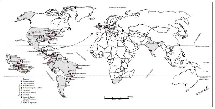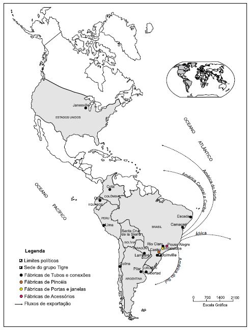 As escalas de atuação dos dois grupos apresentam diferenças notáveis. Os ativos do grupo Tigre demonstram uma topologia birregional, com atuação restrita ao continente americano, embora haja exportação a vários países da África (entre eles Nigéria, Angola e Moçambique) (Figura 2). No caso do Mexichem, seus espaços de acumulação podem ser analisados segundos os ramos econômicos. Em química (ácido fluorídrico) e produtos de plástico, a dimensão espacial é multi-regional (América do Norte, Europa e Ásia), enquanto em geotêxtil (América do Sul) a topologia é regional [7] (Figura 3).