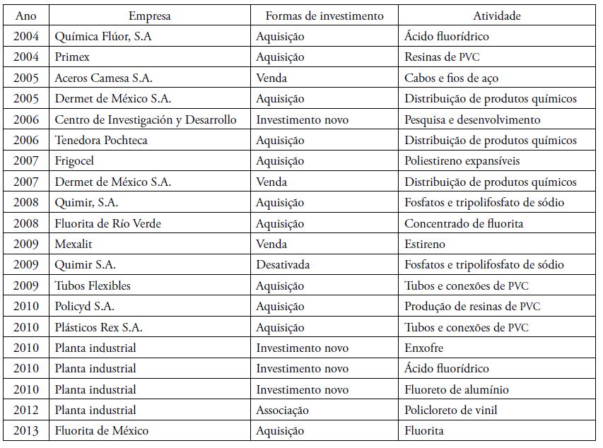No Quadro 1, aparecem alguns aspectos das estratégias corporativas do Mexichem: a) predomínio da centralização (aquisições e fusões) em vez da concentração de capitais (investimentos novos);