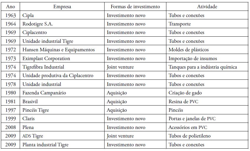 A internacionalização produtiva do grupo Tigre deu-se nos 1970, quando constituiu no Paraguai, em parceria com empresários locais, a empresa Tubopar (Quadro 3). Após essa inserção internacional, “consolidou bases para exportações por meio de subsidiárias que levavam as mais variadas linhas de produtos a todos os países do continente sul-americano, além da Nigéria, Angola, Porto Rico, Guatemala, Estados Unidos e Canadá” (Reis et al., 2013:8).